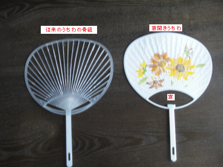 窓開きうちわ 従来のうちわの骨組みと窓開きうちわ