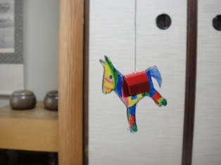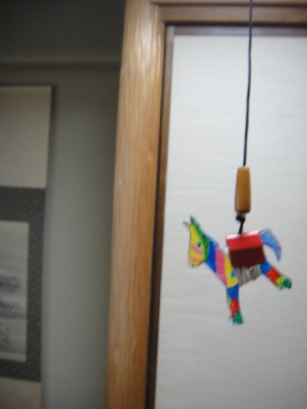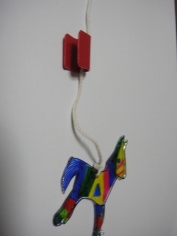 写真をクリックすると拡大写真が見られます 任意の形状の糸巻き(馬の胴部)にストッパーを取付けるだけです、就寝時にストッパーを外し、蛍光灯の紐を手元まで下ろし翌朝に巻き上げるだけ10秒もあればOKです。実用的です。 (蛍光灯スイッチから下に吊り下がった糸巻き引いて、寝たままで点滅出来ます。)