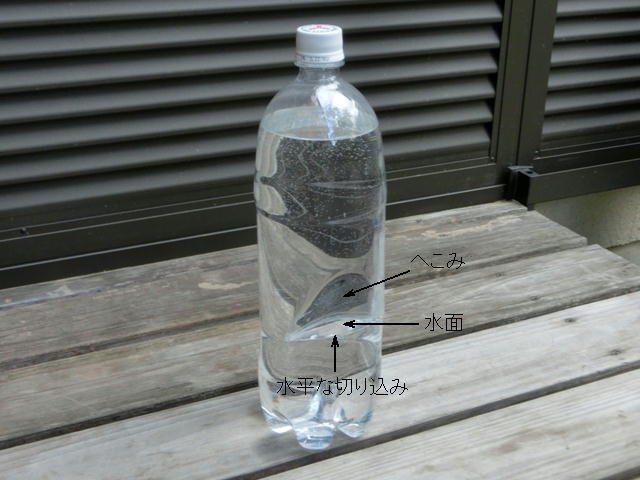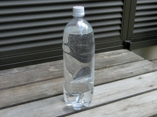 写真をクリックすると拡大写真が見られます 水の入ったペットボトルの中央の大きな穴から水がこぼれ出さないふしぎなボトル。 ペットボトルの中央にカッターナイフで切りこみを入れ、切り口を押し開いて開口部を作ります。ペットボトルに水を入れてキャップを閉めます。あらふしぎ開口部から水が漏れません。