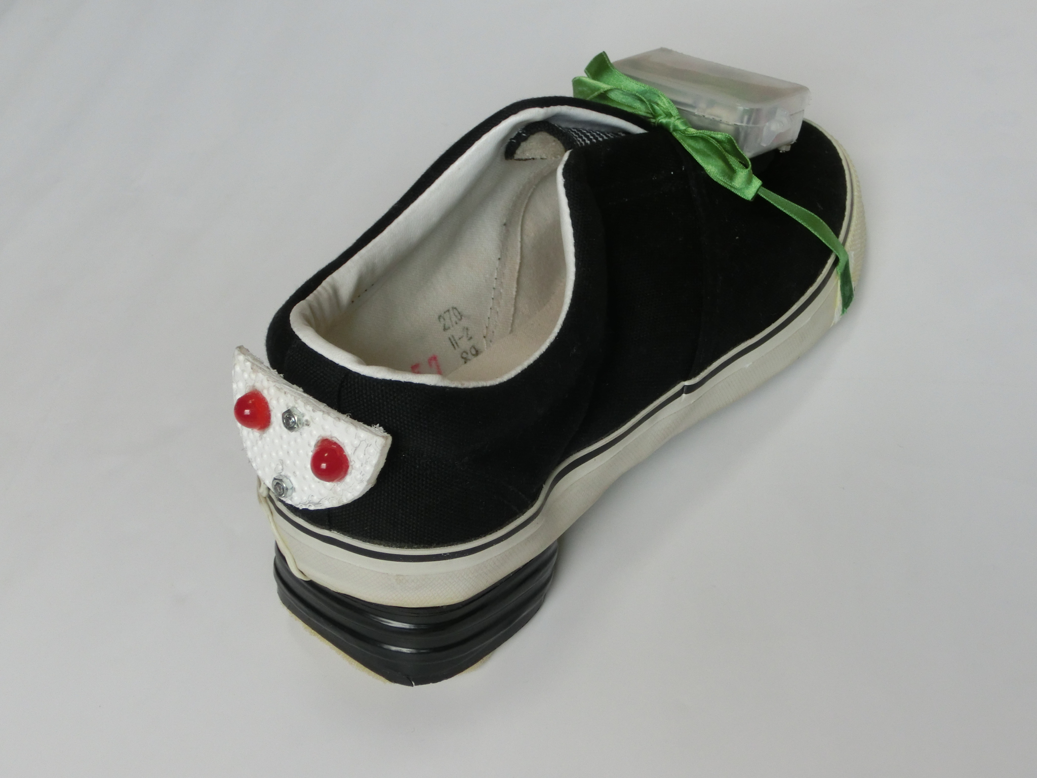 写真上 靴の外観 靴の後の二つが赤色LEDで、足が地面に着くたびに一瞬点灯しはっきりと視認出来ます。足が地に着く毎に点灯するため夜間のランニングやウォーキングによる利用が考えられ、歩行者への視認性が高まることにより安全性の向上が計れます。