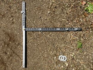 写真をクリックすると拡大写真が見られます 簡単な木の高さの測り方 計測する木から10m離れて、曲尺に付いている照準器で梢に照準を合わせ、垂れ下がったワイヤーと目盛との交点の読みが木の高さになります。 樹高計に必要な事は「直角」と正確な「目盛り」です、この点曲尺はぴったりです。