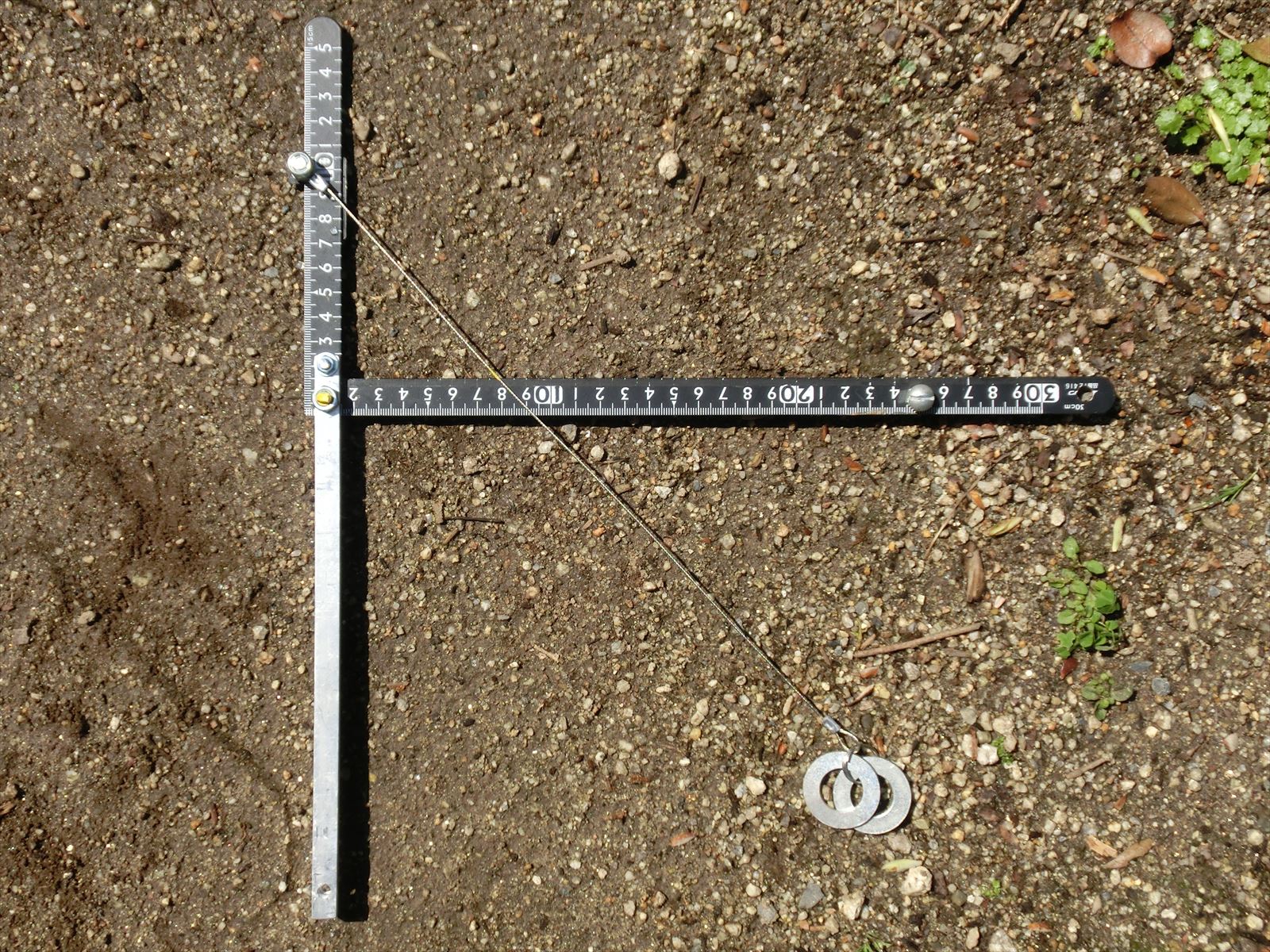 写真上 曲尺樹高計(三角法応用) おもりのついた糸は短辺10cmの位置にぶら下げています。 長辺にある黄色部とマイナスネジのマイナス部が照準器になります。(伏角の照準器は裏側にあります。)