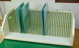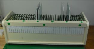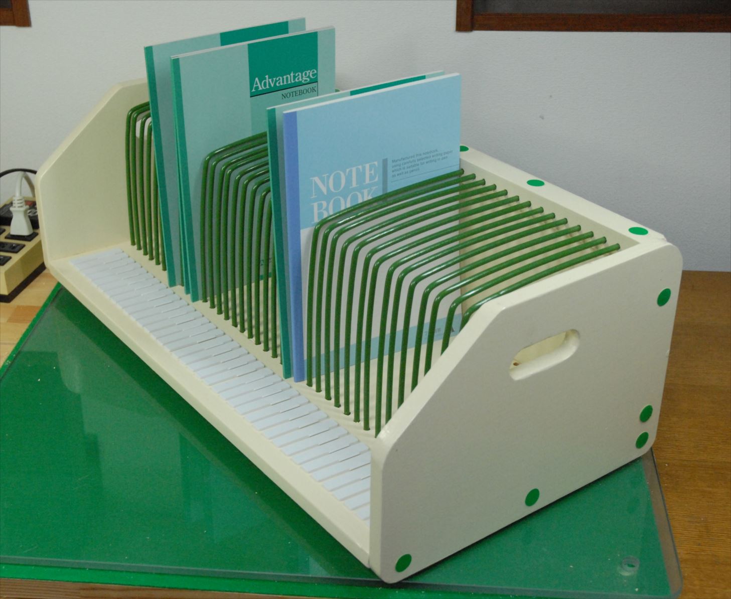 写真をクリックすると拡大写真が見られます 小学校の先生の要望で宿題提出用の本立てを作りました。 本立てには各生徒の名前を書く名札があり、生徒が自分の名前のところに提出すると 提出状況が一目でわかります。ノートを並べる手間も不要です。